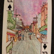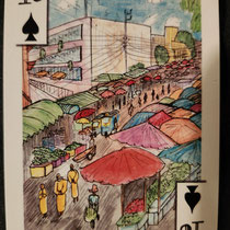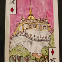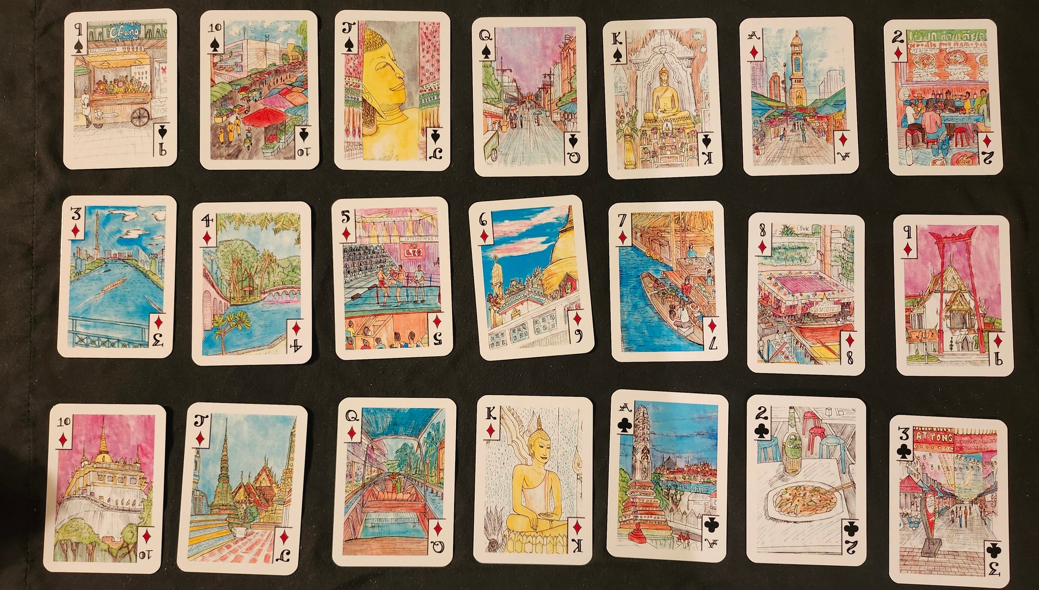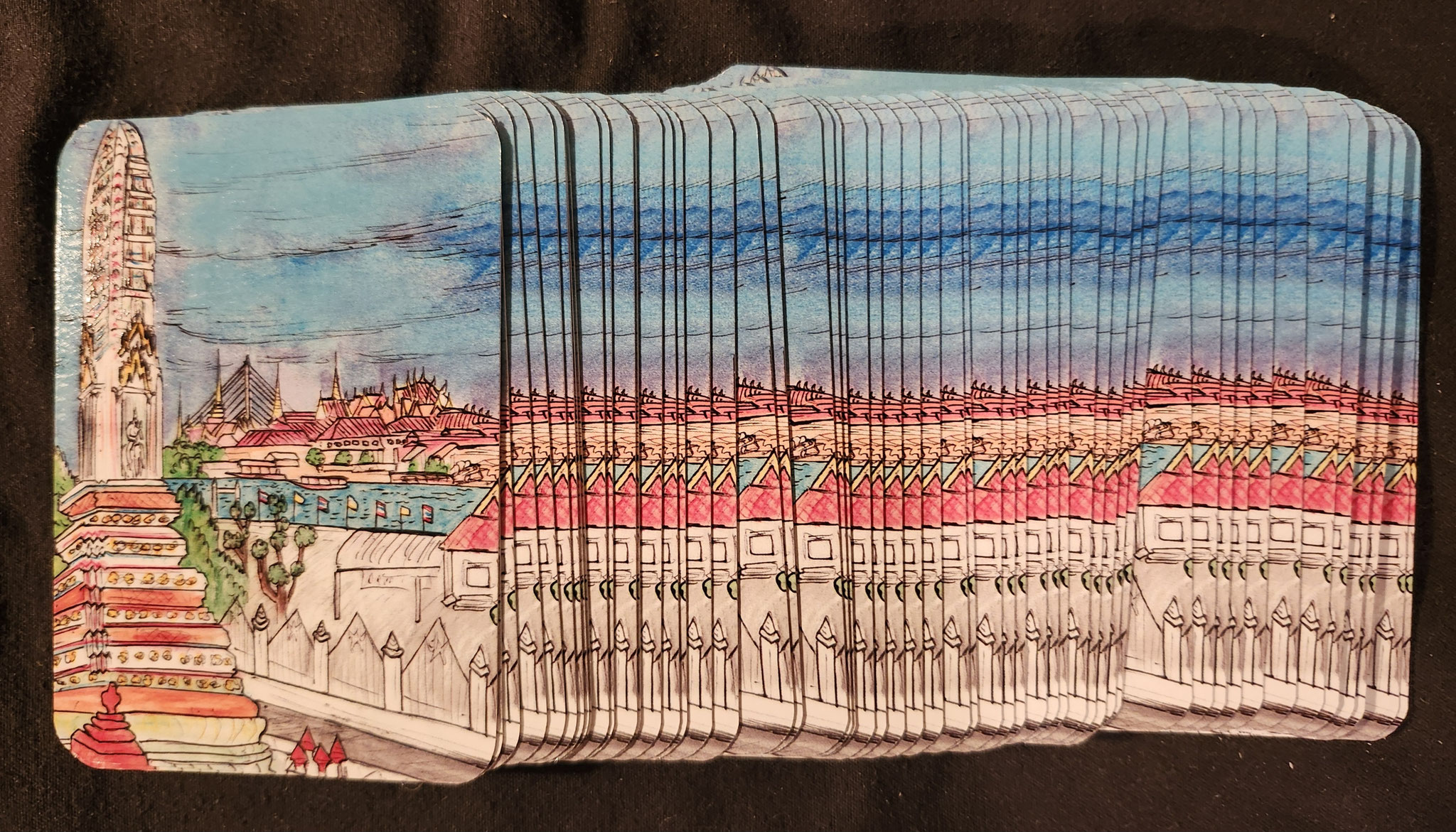 Sketched in the springtime, featuring famous places like Wat Po, Grand Palace, Khao San Road, Chatuchak Market, Floating markets, food, tuk-tuks, and more temples.
