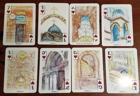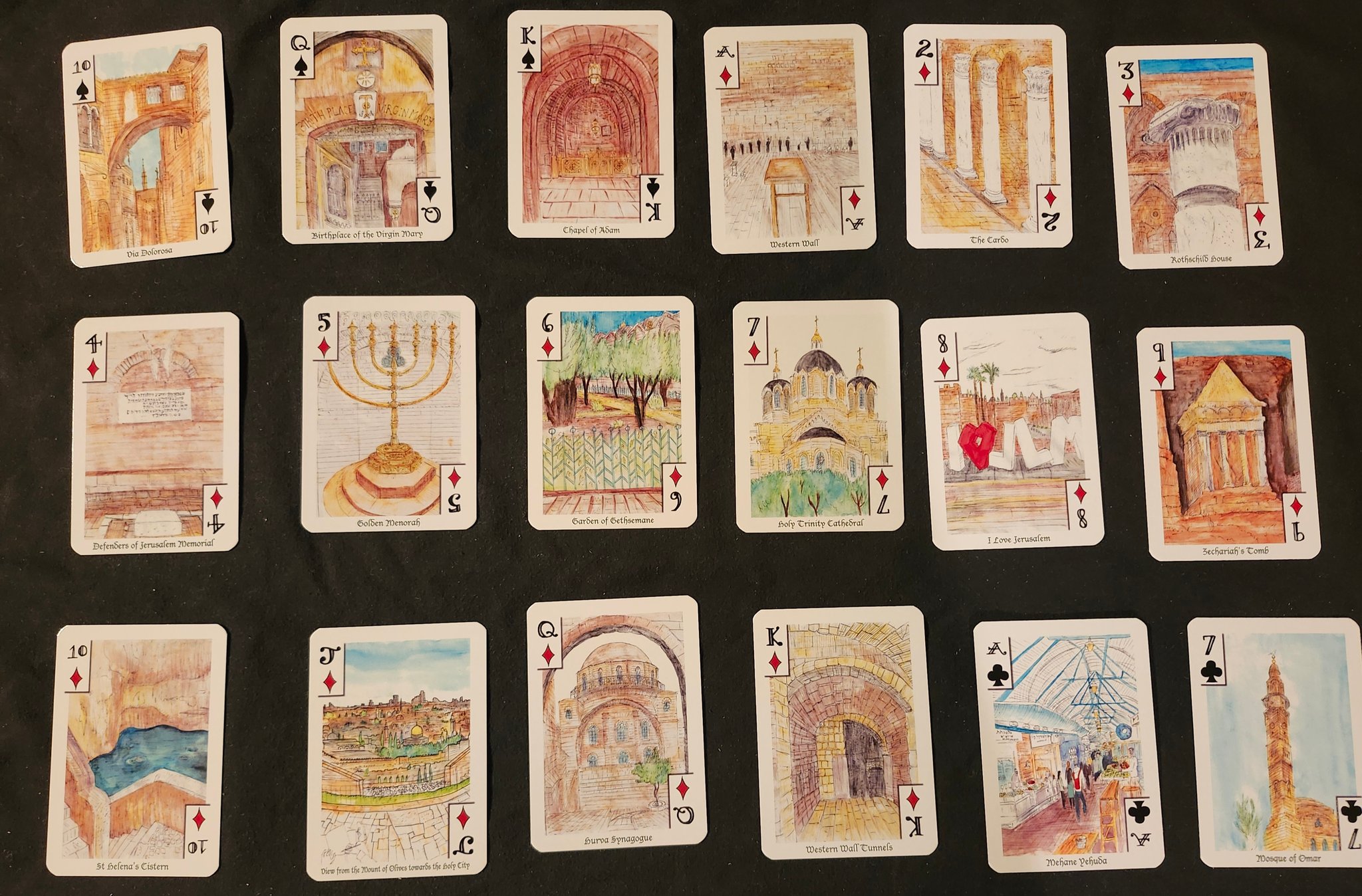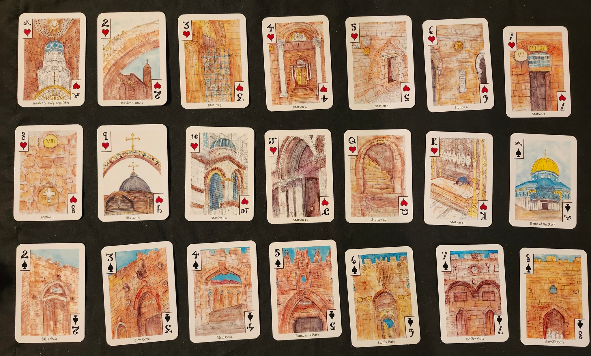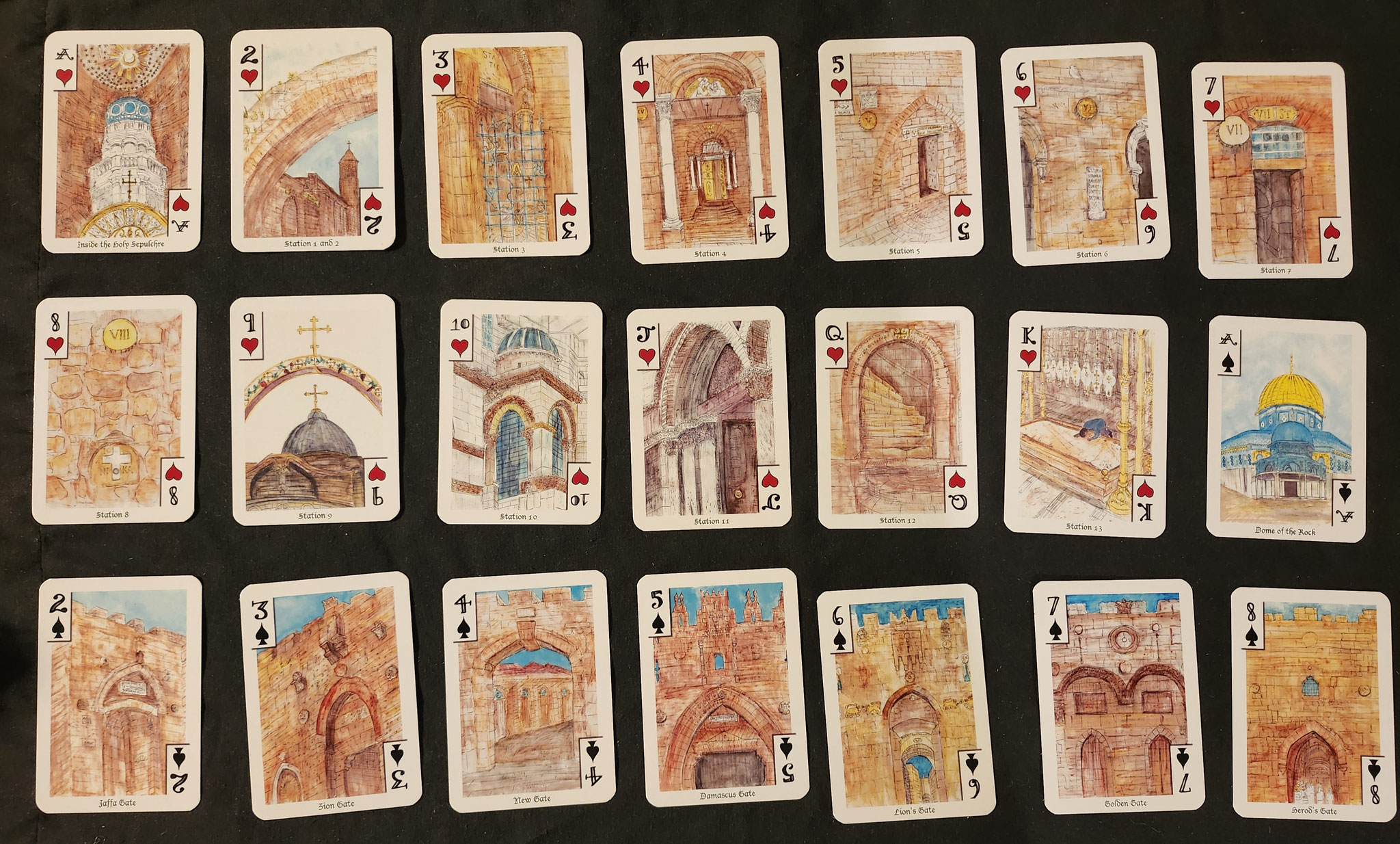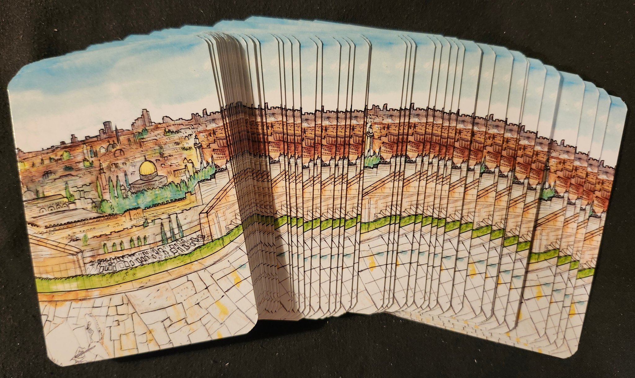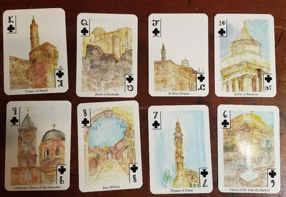 Features landmarks of the Old City (and a few New City places) Via Dolorosa, Temple Mount, Mosque of Omar, Holy Sepulchre, Mt of Olives, Jethsamine, Absalom Tomb, all the Gates, and some typical scenes. I wandered the ancient streets and took in the history as I sketched.