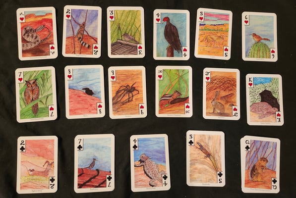 Another desert deck brought to you by Father-Son Team Trotter. Featuring many beloved animals and favorite hikes. This deck is made to celebrate JT and all the Park has to offer. Including famous landmarks like Skull Rock, Keys View, Jumbo Rocks, Arch and Heart Rock, and a few secret places. With a map and index.