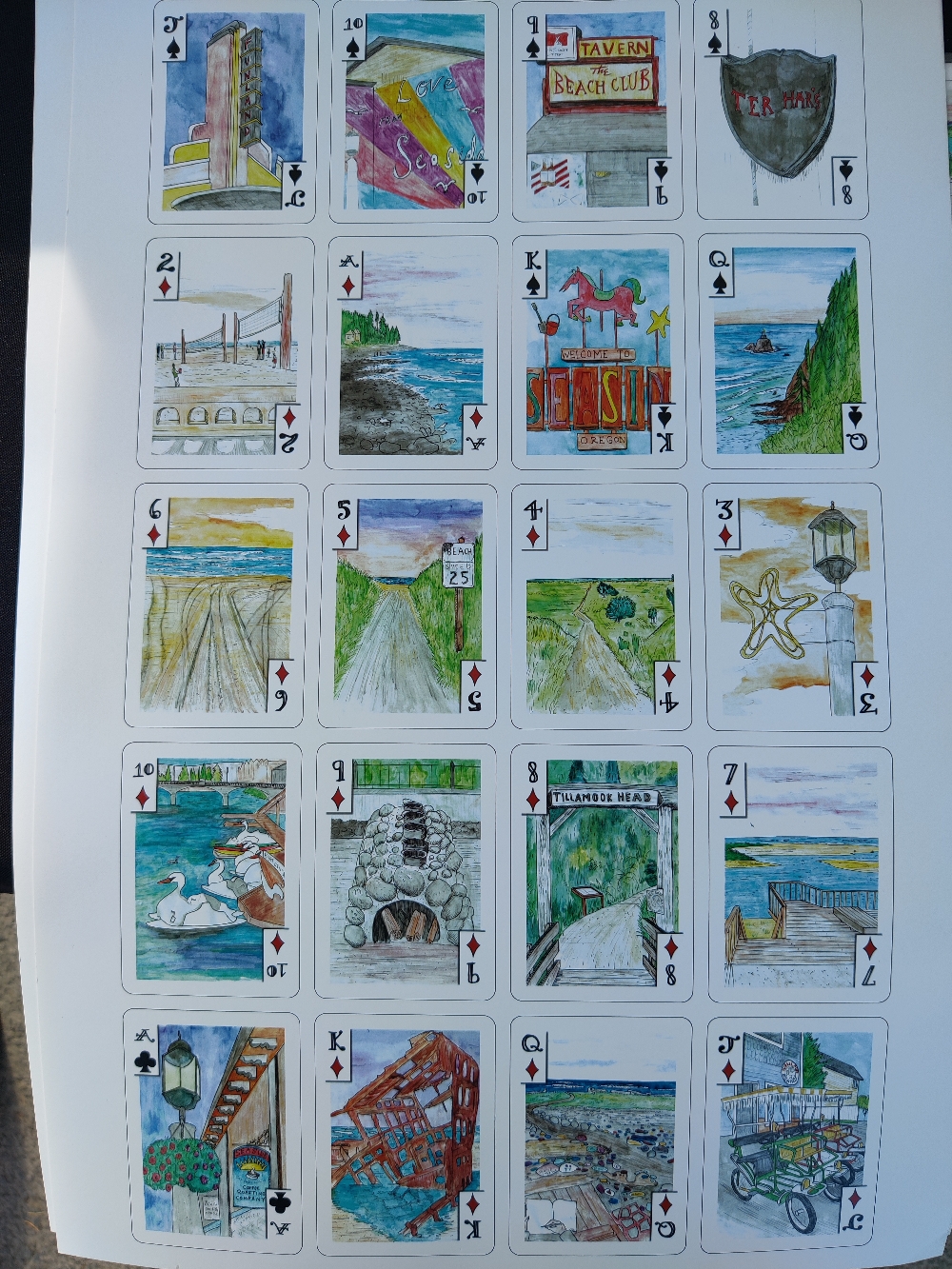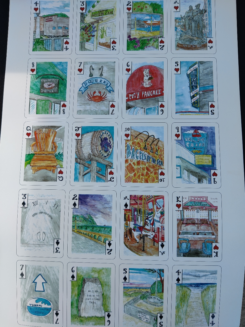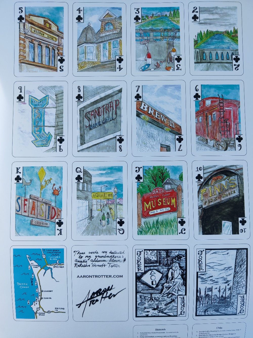 Featuring all your favorite beach town places! Celebrating the Centennial of the Promenade for 2021, this deck includes Funland, the Aquarium, Finn's, Dooger's, Ter Har's, Seaside Brew Co, Pig n Pancake, The Cove, Painted Rock Beach, Nacanicum Estuary, Lewis and Clark Salt Works, and many more. Sketched on location in the busy summer months, finished with watercolor pencils. Includes an Index and Map