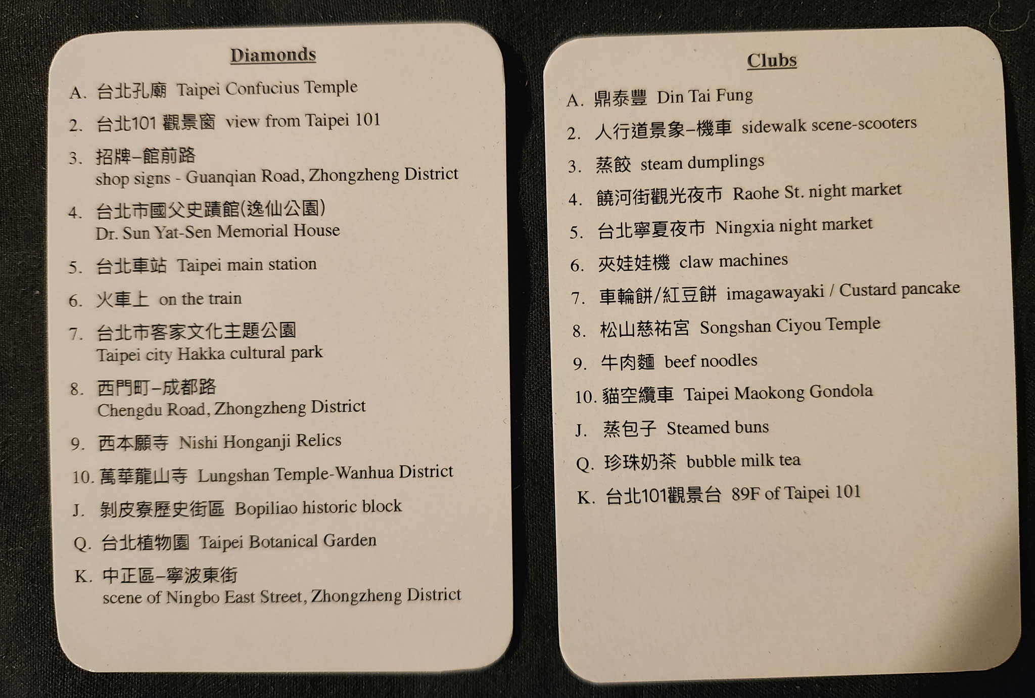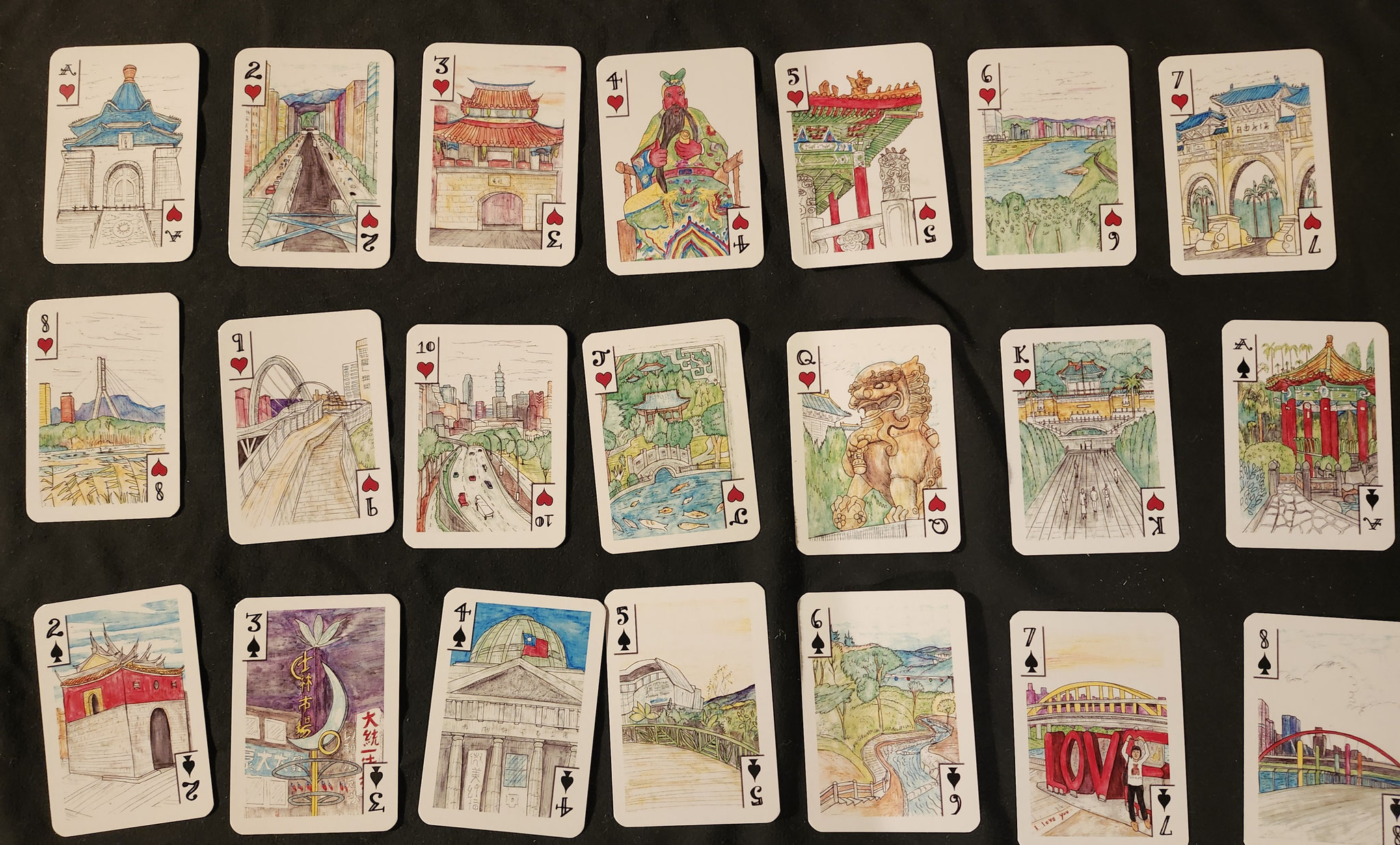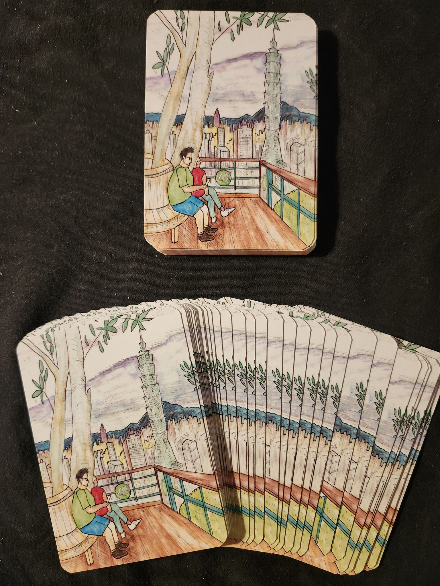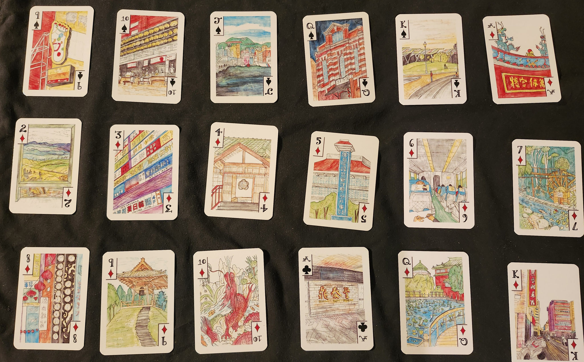 This deck celebrates Taiwanese culture and famous places in Taipei, like Taipei 101, local foods, night markets, National Palace Museum, temples, parks and gardens. I spent 1 week there exploring and sketching.
